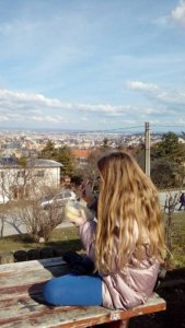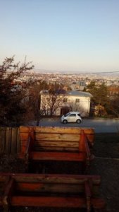 Ez az a hely, ez az a környék, ahol oly sok boldog órát eltöltöttem kisgyerekkorom óta. Emlékszem, ahogy apukám mindig nosztalgiázott, hogy gyerekkorában, amikor még csak egy két ház volt a környéken, hogyan játszottak, bandáztak a helyi fiúkkal itt, hogyan derítették fel az összes környékbeli barlangot, amelyek azóta már réges régen mind le vannak zárva. Ma már én folytatom helyette a nosztalgiázást. Igaz, én nem mehettem a barlangokba, de kirándultam sokat a környéken, szedtem ibolyát tavasszal, szánkóztam télen az Antónia lépcsőn. Szeretnék ebből az érzésből, ezekből a szívmelengető emlékekből egy kicsit én is továbbadni a kislányomnak. Ma pedig olyan szépen sütött ismét a Nap, a tavasz lehelete hívogatott ki a természetbe, ezért azt találtam ki, hogy iskola után nem a szokásos rutint követjük, és nem megyünk haza ebédelni, hanem piknikezünk a téren, és közben gyönyörködünk a panorámában.